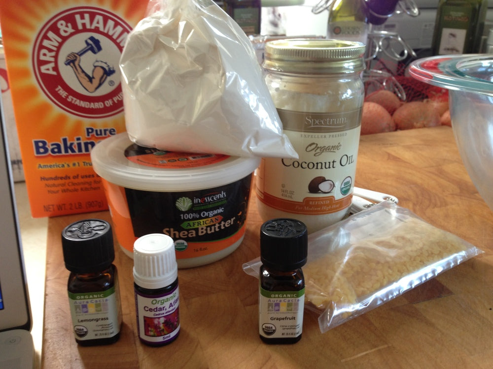 So here's what I did: 2 Tbsp. beeswax pellets 1 Tbsp. shea butter 5 Tbsp. coconut oil 1/4 cup arrowroot powder 1/4 cup aluminum free baking soda 10-15 drops lemongrass essential oil 10-15 drops cedar essential oil 2 deodorant tubes (cleaned out, if used!) Step 1 - create a double boiler with a glass bowl (i used a pyrex - easy to clean wax out of) and a pot of boiling water. melt the beeswax pellets in the bowl. Step 2 - add the coconut oil and shea butter to the melted beeswax. stir occasionally until completely melted and remove from the heat. Step 3 - stir in the arrowroot powder and baking soda until no clumps remain Step 4 - stir in the essential oils and pour the mixture into the deodorant containers. you'll want to let the mixture settle in the containers for a couple of hours before putting the lids on and/or using. So a few caveats would be that this is deodorant and not antiperspirant, keep in a cool place, only roll up what you intend to use because this will be softer than regular deodorant and use sparingly. Next homemade skincare project will be lotion!