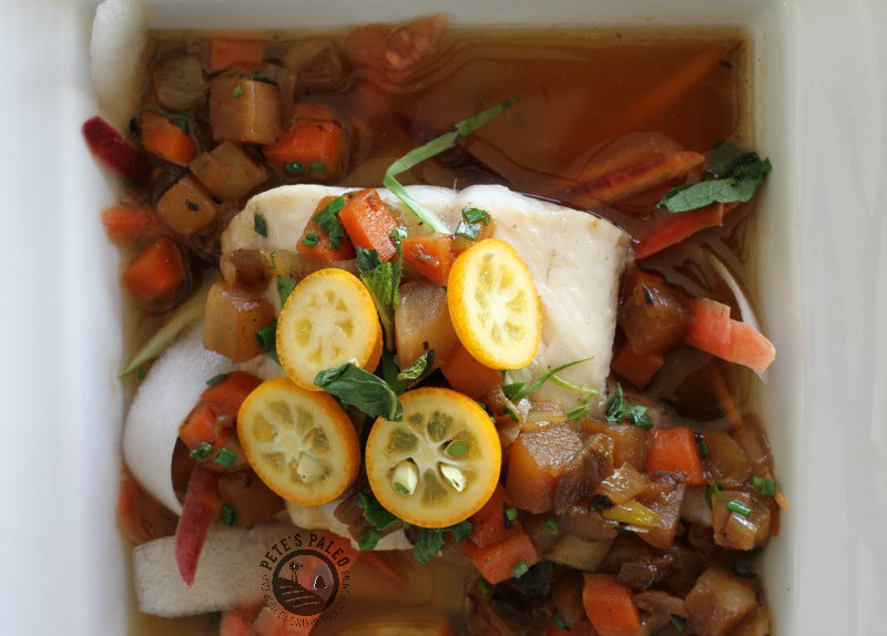 Duck Fat Poached Sable Fish with Ruby Carrot and Daikon Radish Noodles in a Dulse Bonito Broth and Roasted Turnips and Carrots Topped with Kumquats and Mint