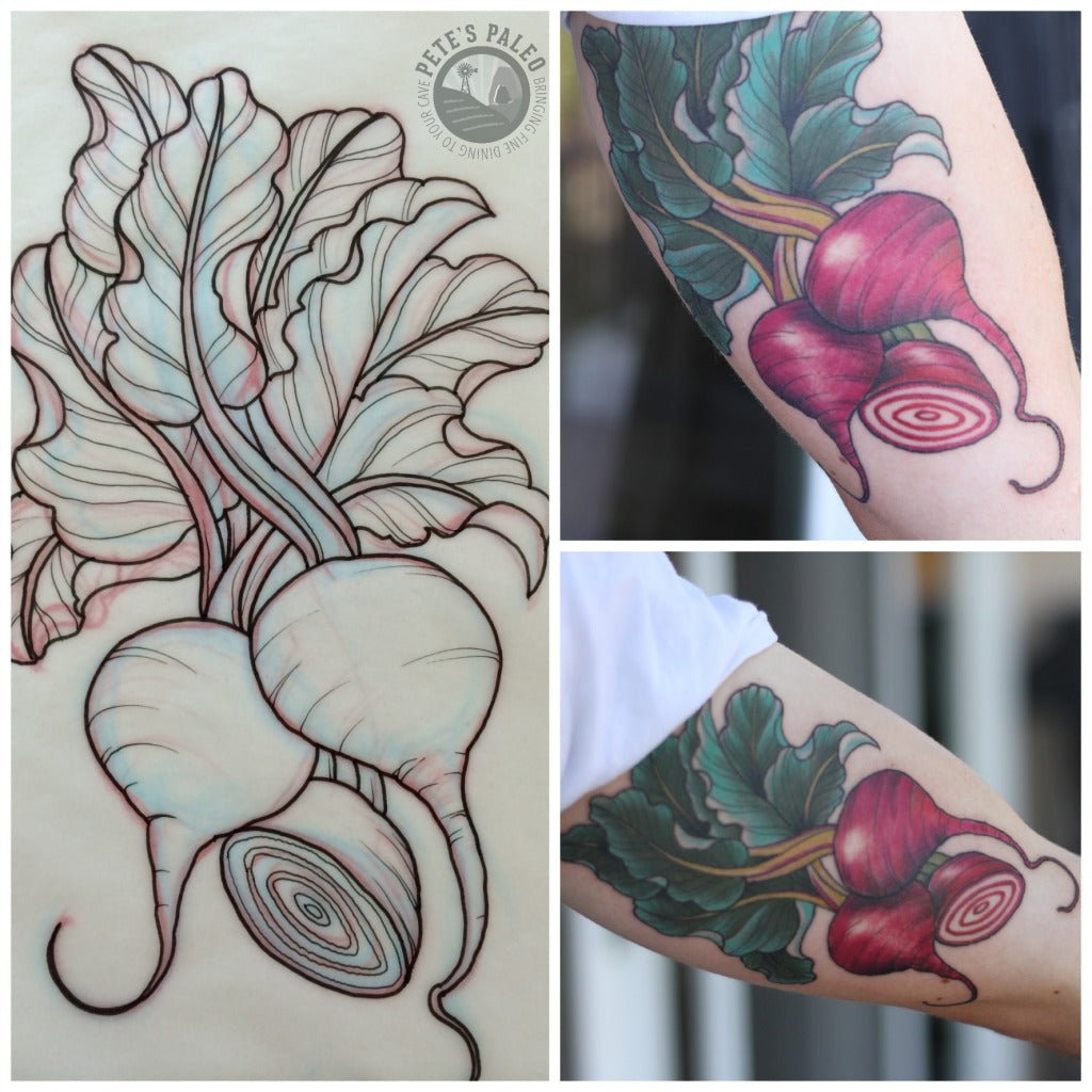 But the main reason, the biggest, is a book called "Jitterbug Perfume" by Tom Robbins. You see Beets are serious things, but they just bring so much to the table. They kind of deserve a certain level of respect, don't you think? If it sounds like I've gone off the deep end, I suggest just reading the book. So in honor of my favorite vegetable and in hopes of finding out what all this tattoo stuff is about, I'll be having some beets immortalized on my arm come the 5th of September. Here's a rough sketch: