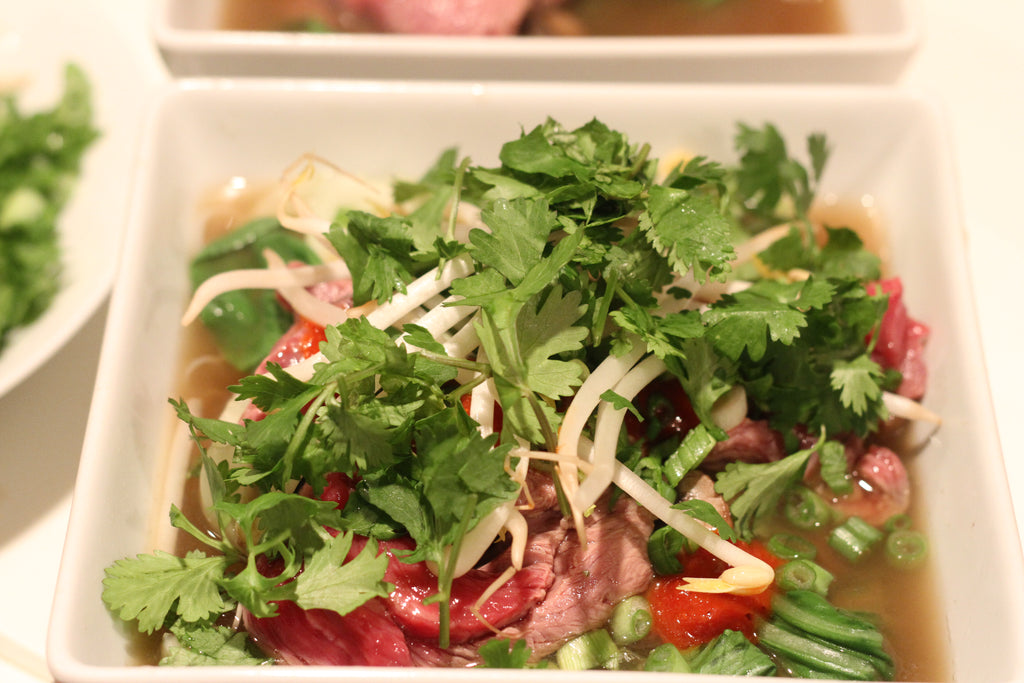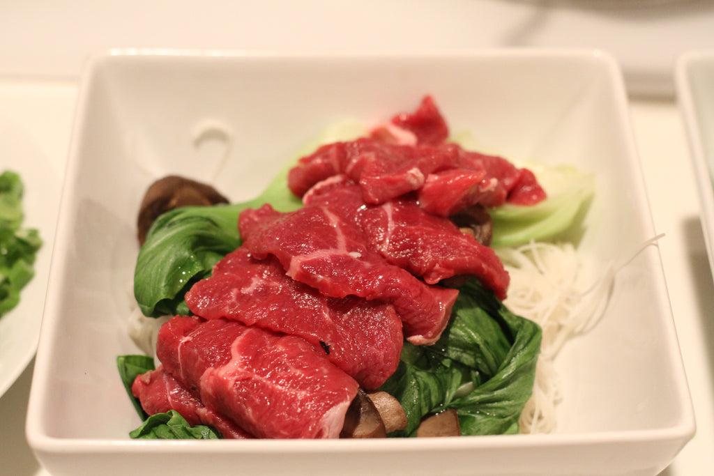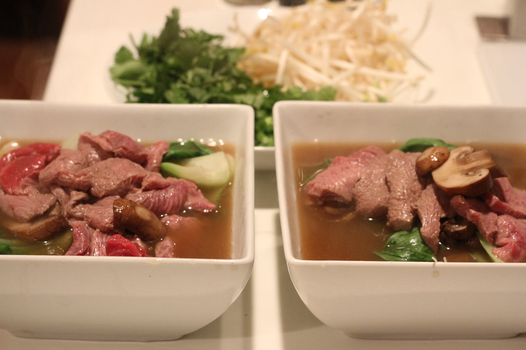 For this batch we used bok choy and mushrooms for the vegetables. Peel the bok choy off of the stalk one whole leaf at a time. Rinse with cold water to make sure there is not dirt left. Rough chop the mushrooms and simmer in the broth for 15-20 minutes. While the mushrooms are simmering, bring 4 qts of salted water to boil for the rice noodles. When water is boiling add bok chou to broth then begin to cook rice noodles. The will cook in 2-4 minutes, strain and transfer to two bowls, dividing evenly. Using tongs or slotted spoon pull vegetables out of broth and spoon over noodles. Turn broth on very high and lay raw meat on the vegetables. When broth is boiling pour directly over the meat. Serve immediately with garnishes and some paleo Sriracha. Salt broth to taste as you go. Enjoy.