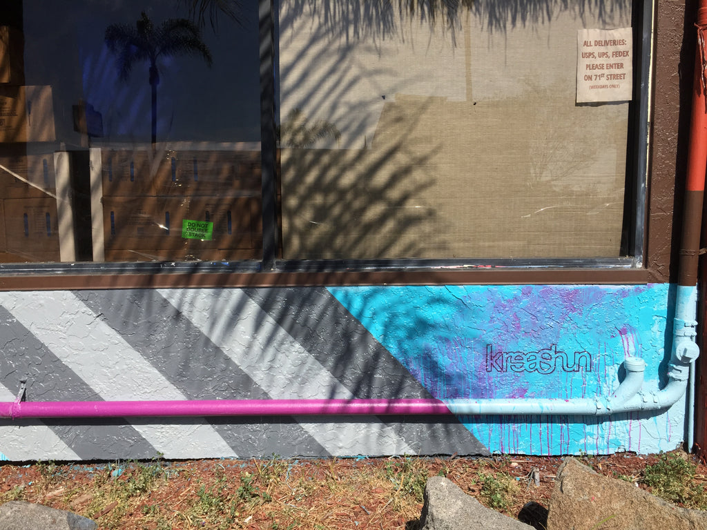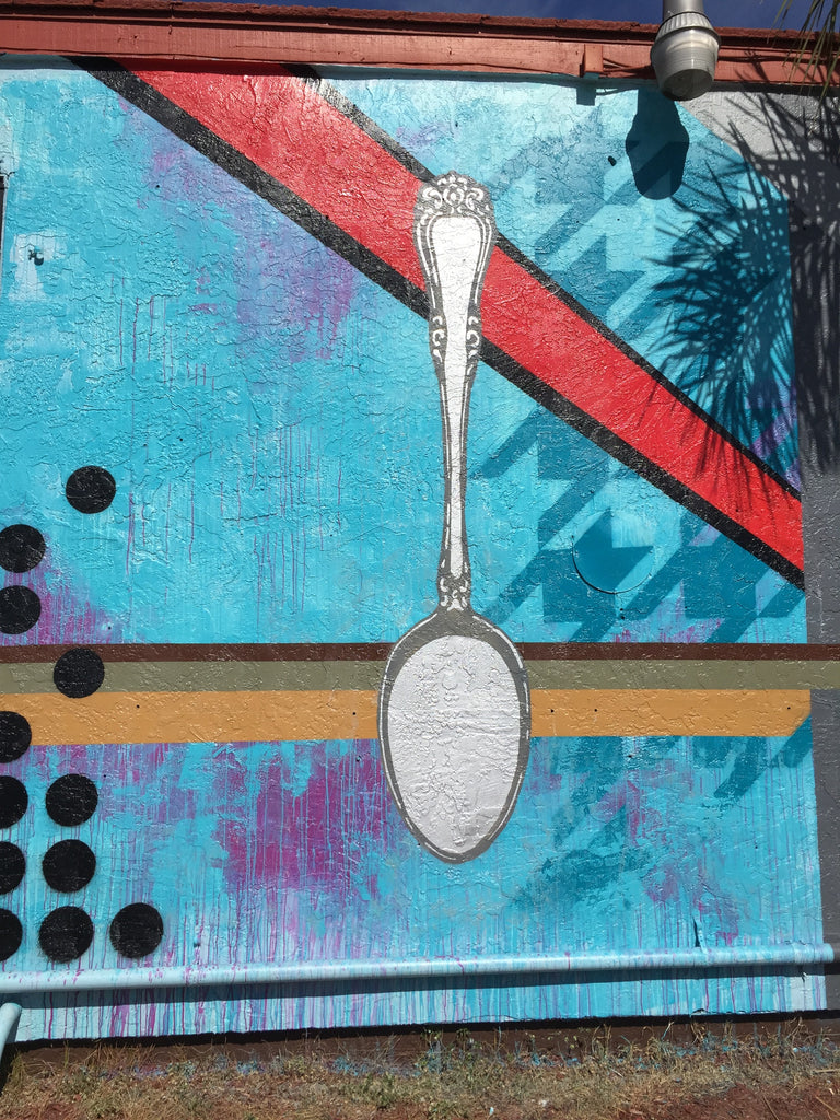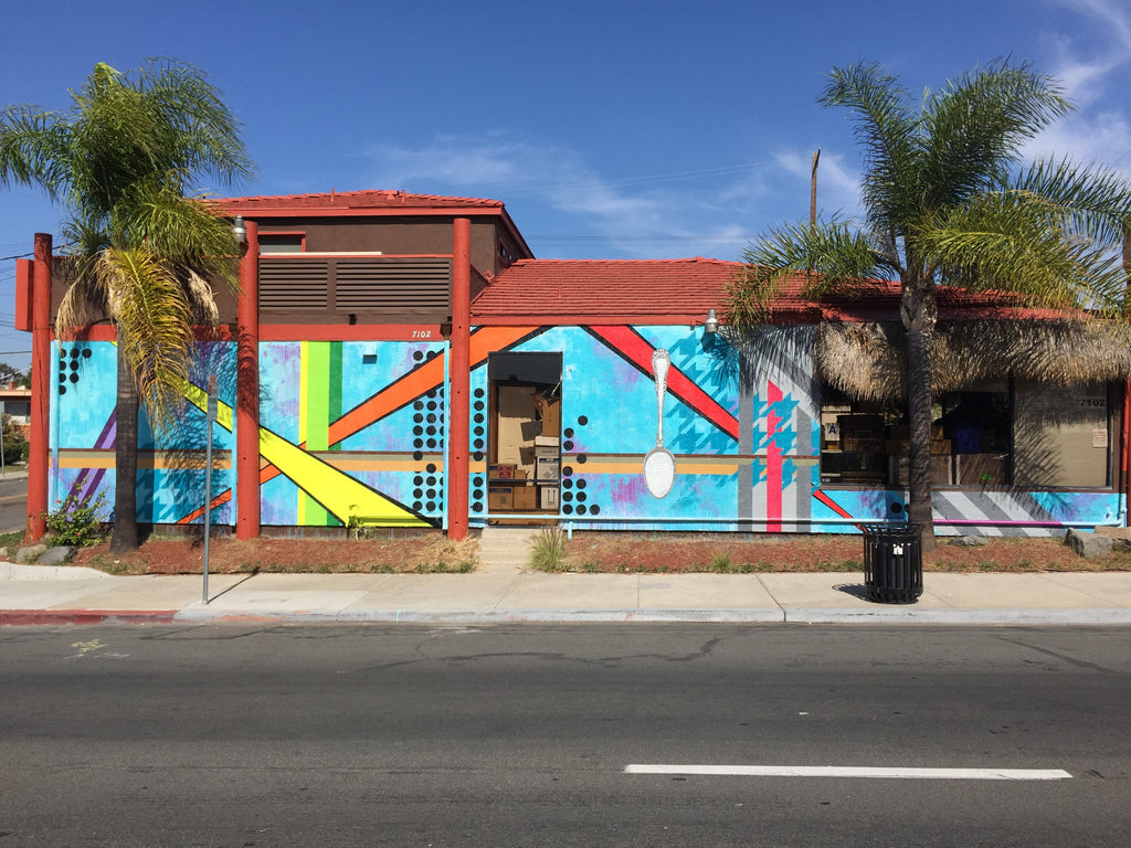 So Pete and I hired a friend of mine from college to spice things up. His name is Monty and he is a mural and exhibit artist based locally in San Diego, but does projects all around the country. You can check out his projects here. Together, with his friend Jason, they form a collaborative group called Kreashun, and they were the driving force behind our new mural. For us, this was a way to give back to our community, both where our kitchen is located, and to the artists who designed it. Here are some pictures of the wall, and you can check out the Kreashun site for work in progress pics! Wondering about the spoon, check out this blog post for background on Pete's love of spoons.