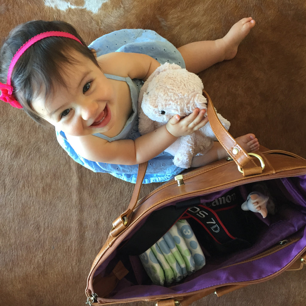 I currently am rocking the Esther, which has room for my laptop, camera, extra lens AND diapers and toys. It also has this convenient front flap pocket which has room for my driver's license, credit card and money. The inside is totally customizable and comes with removable inserts to protect the camera body and lenses. Or you can use it as dividers to keep your everyday purse items organized.