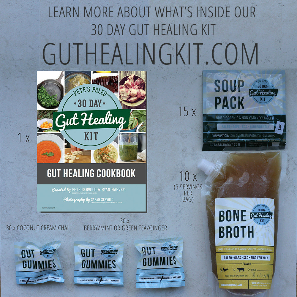 Another really cool item Pete prepares is his gut healing kit. When you're in the early stages of re-learning about food and nutrition, and how our bodies really need to be fed to be healthy and well, it's important to focus on gut health to heal any damage done to your gut over the years. Almost all of the items on my Top 5 Foods You Need To Be Eating post from last week are also gut healing foods - and the gut healing kit actually comes with a couple of them! First, you have a 30-day supply of Pete's bone broth. Bones from ethically raised animals and organic vegetables simmered for days to create a collagen-rich broth that's full of easily digestible protein and gut-healing properties - Pete does his broth the way it was meant to be done! I usually drink my broth like a hot tea, with a pinch of salt and some seasonings, but you can use it in soup - and to make it easier to make soup on the go, Pete thoughtfully included 15 packs of dehydrated veggies to the kit. You can just add the whole packet to your broth, and voila - instant soup! Because Pete sources all of his veggies from local farms that also grow their veggies the way nature intended, you know that these veggies are the highest quality, non-GMO, and organic. The kit also includes 60 gut gummies - 30 coconut cream chai (fantastic as a coffee creamer!), and 30 of either berry/mint or green tea/ginger. These gummies are full of collagen and gelatin to restore gut health and help your skin, hair, and nails to grow properly. Just pop a coconut cream in your coffee in the morning and have a berry/mint as a snack in the afternoon for thirty days, and you're well on your way to gut health! An important thing to note is that this kit is meant as a supplement to an anti-inflammatory diet, it's not meant to be your sole source of nutrition for the 30 days. Not one to leave you without some reading and extra support, Pete also includes an e-cookbook with 25 gut-healing recipes, and a list of tips and tricks to help your gut healing. Once you've tasted Pete's meals you know that he is an incredible chef, so you can trust that the recipes are amazing! While the gut healing kit is an incredible jump-start to gut health, using Pete's recipes and tips will just help you to continue your gut health journey and be on your way to health and wellness.