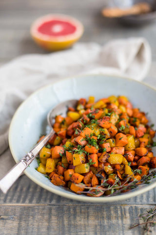 Grapefruit + Thyme Glazed Root Vegetables: Beets, sweet potatoes with a kick of citrus result in pure deliciousness.