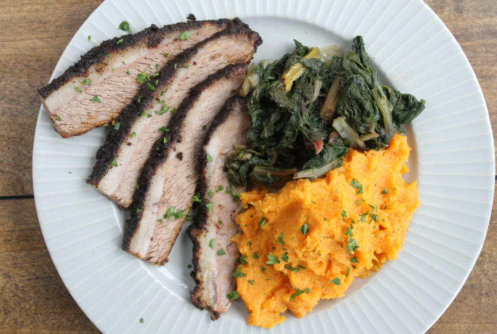 Our Menu Pick: BBQ Brisket with Sautéed Greens and Sweet Potato Mash