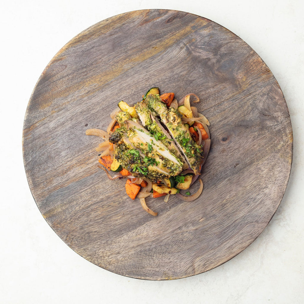 Arugula-Basil Pesto Chicken with Roasted Veggies