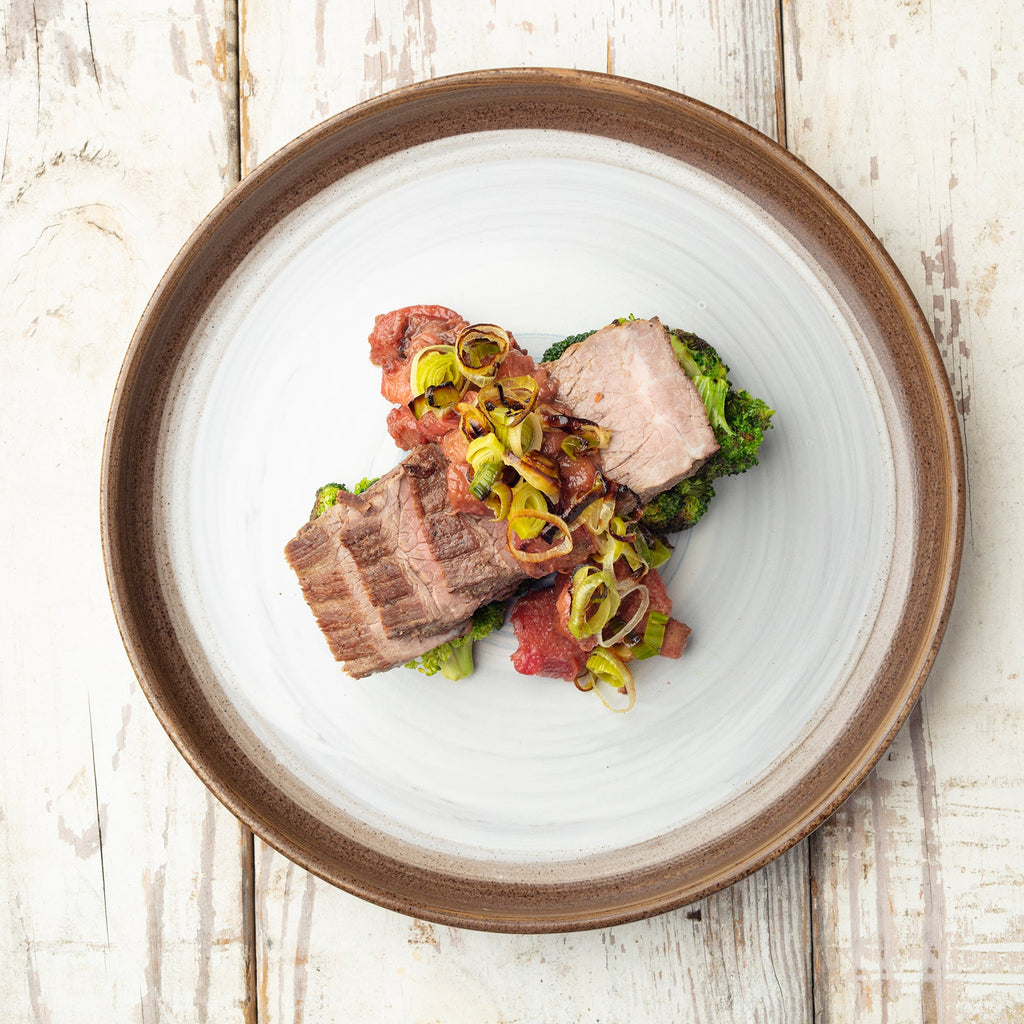 A perfectly grilled, tender steak accompanied by roasted broccoli and mild, slightly sweet spring onions, complemented by a vibrant, tangy rhubarb chutney that brings the dish together with a touch of brightness and depth.