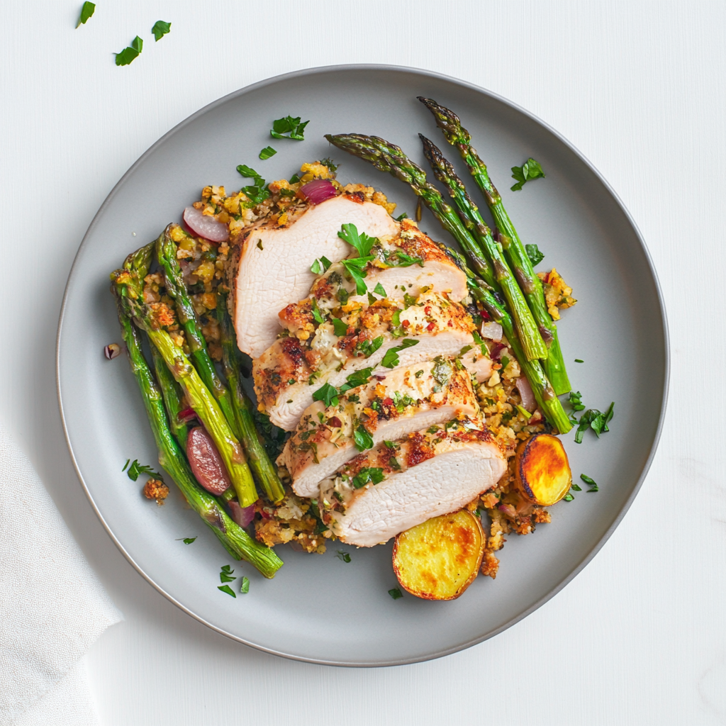 A juicy, grilled chicken breast, topped with a fragrant arugula-basil pesto, and served alongside roasted seasonal vegetables like zucchini, bell peppers, and cherry tomatoes. This dish is a burst of fresh flavors, rich in healthy fats and antioxidants.