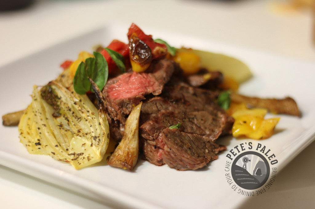 Lime, Garlic Wood Grilled Chicken Thighs with sautéed peppers, roasted