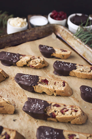 These chocolate-covered biscotti will make the perfect little dipper for your dark roast, or you can pack them into gift bags for friends and family to enjoy after their holiday meal.