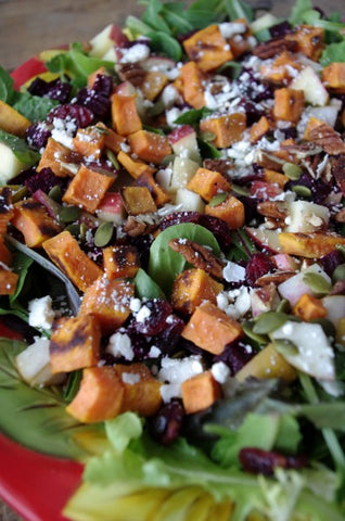 Autumn Arugula Salad with Caramelized Squash & Pomegranate Ginger Vinaigrette — substitute coconut sugar or raw honey for the brown sugar on squash to keep it strictly Paleo