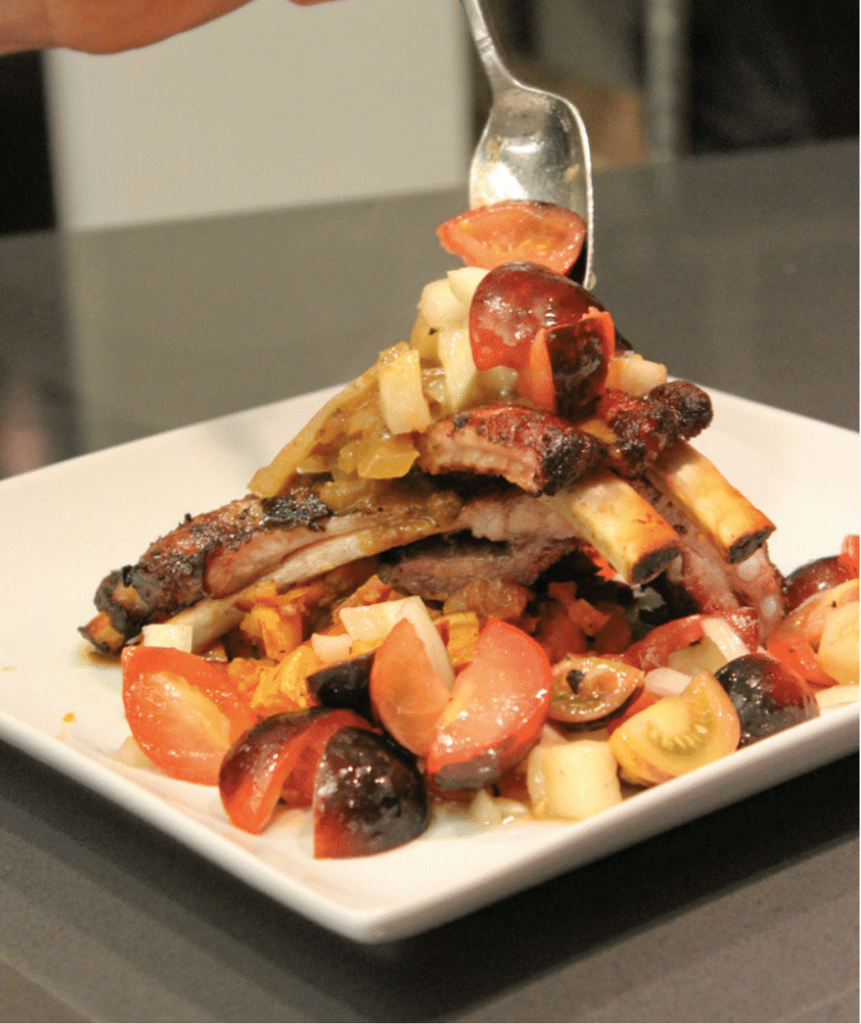 - To serve, pour the braising liquid, onions, and tomatoes over the top of the ribs.
