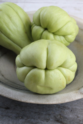 Chayote Squash has many names; pear squash, vegetable pear, cho-cho, christophine, pipinola, and as I like to call it “Abuela” or grandma squash due to the bottom of the squash resembling grandma when she forgets to put her teeth in. It is a fruit that is technically in the gourd family along with melon, cucumber, and squash. It is one of my favorite summer squash because of its crisp, fresh, and versatile value. It has the texture of a water chestnut, and a flavor profile of cucumber/apple/zucchini. Its weaker flavor leaves it easy for you to manipulate it into whatever profile you want. Being used in many cuisines such as Asain, Indian, Hawaiian, American and more, its most popular uses are in Latin food. The entire plant is edible making it a fruit of endless possibilities. When shredded or thinly sliced raw for slaws, salads, or crudité, it makes for a wonderfully fresh and bright ingredient. Cooked chayote can be roasted, boiled, mashed, fried, stuffed, or even pickled!