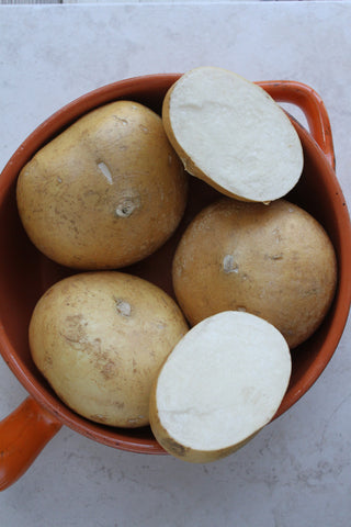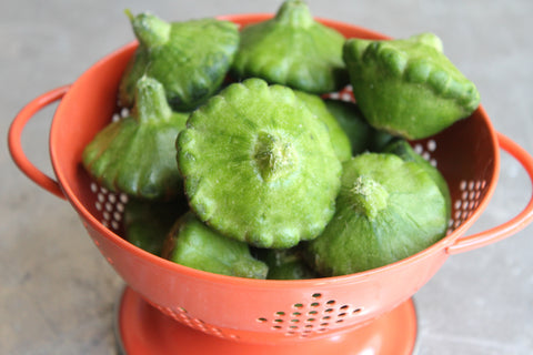 The name Pattypan comes from the identifiable scalloped edges. Remember the cakes grandma used to use with the ribbed edges, like a perfectly folded pie crust? The baking dish used to make those is called a Patty pan. This summer squash just like zucchini, and yellow squash is high in vitamin A and C and has no fat. Its soft texture and delicate flavor allows you to enjoy the squash as nature intended. Keep things simple, and roast or sauté with salt, pepper and olive oil.