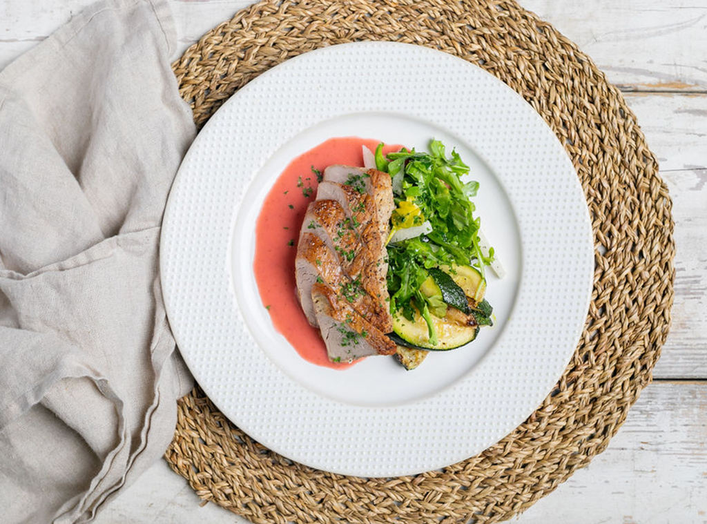 Roasted Pork Tenderloin with Jicama & Arugula Salad with Strawberry-Mint Vinaigrette and Zucchini
