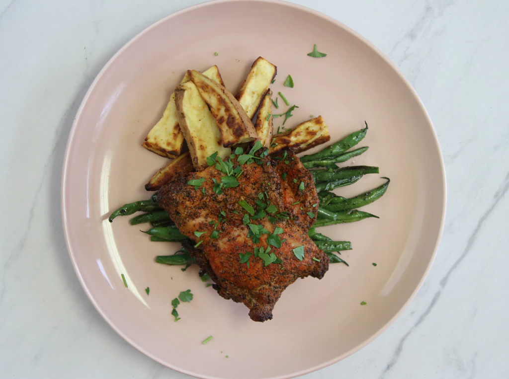 Cajun Roasted Chicken with Southern Green Beans and Sweet Potato Wedges